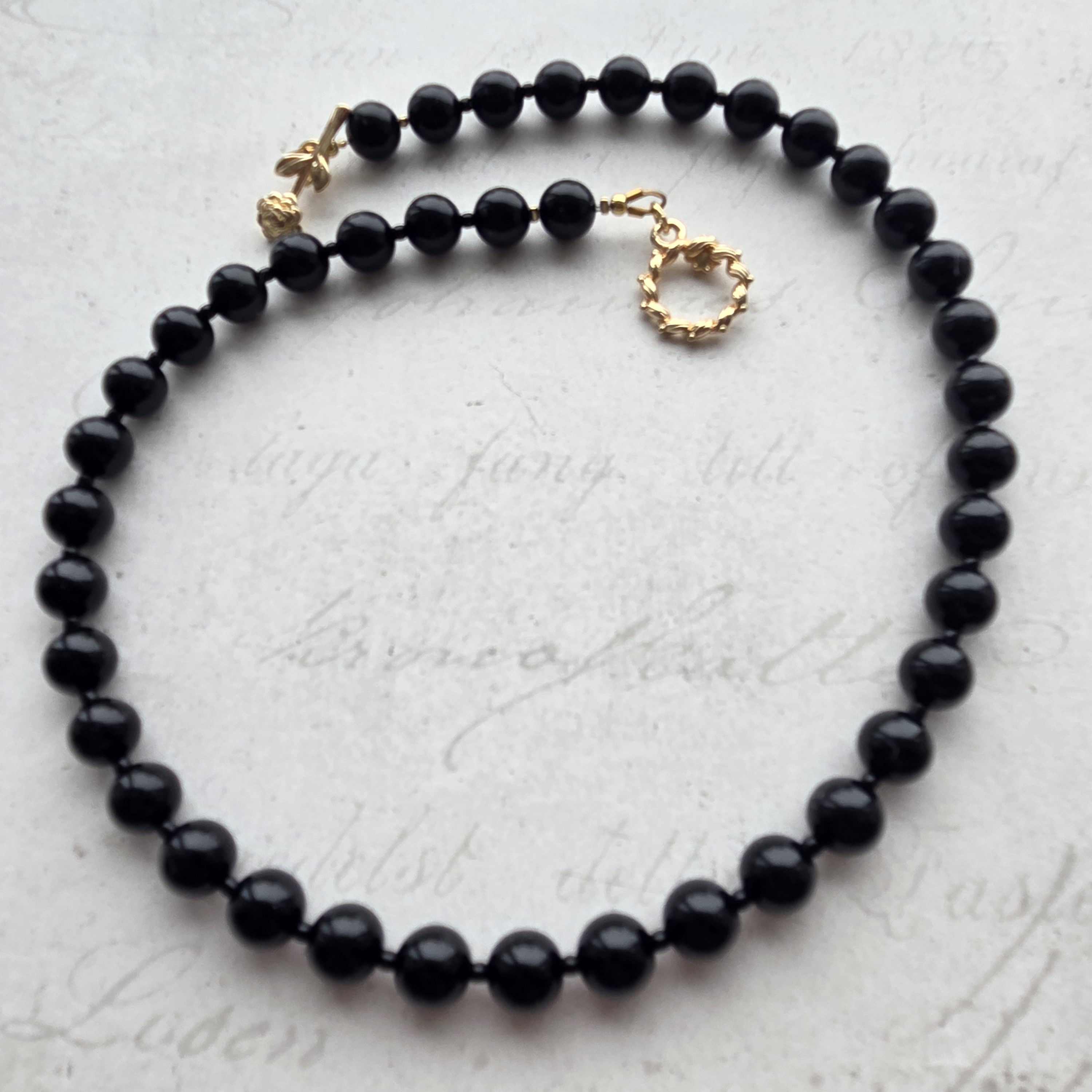Elegantiškas onikso vėrinys su nuostabaus grožio akcentiniu užsegimu - tai ne tik papuošalas, tai istorija. Vėrinys - puikus pasirinkimas norinčioms pabrėžti savo individualų stilių.
