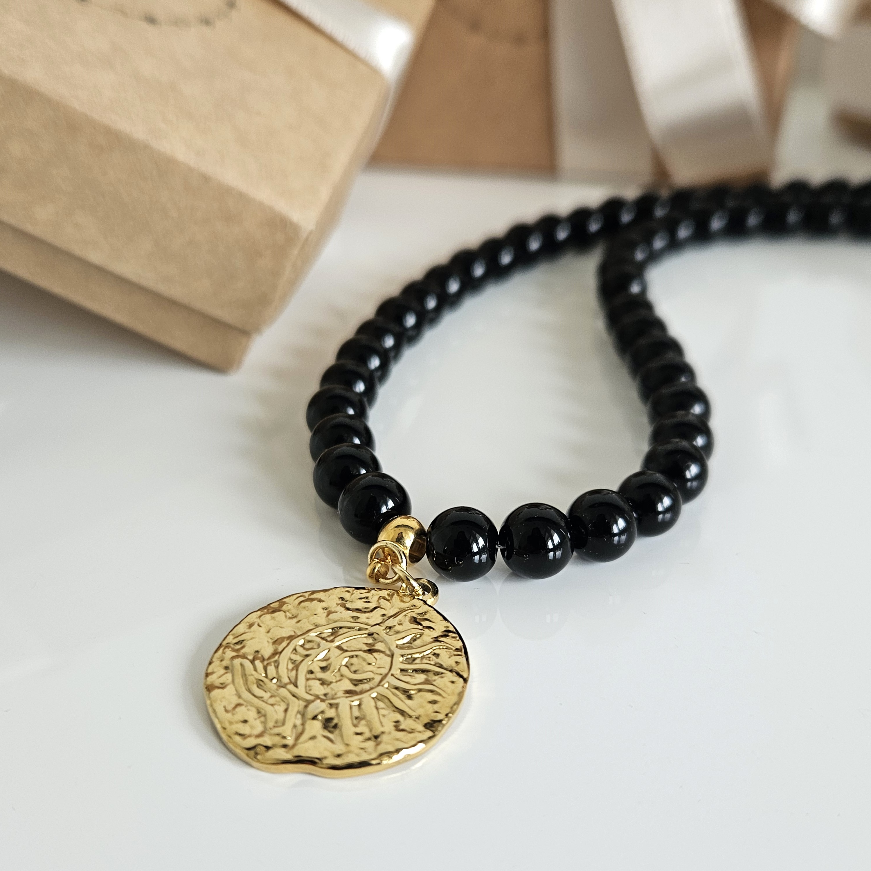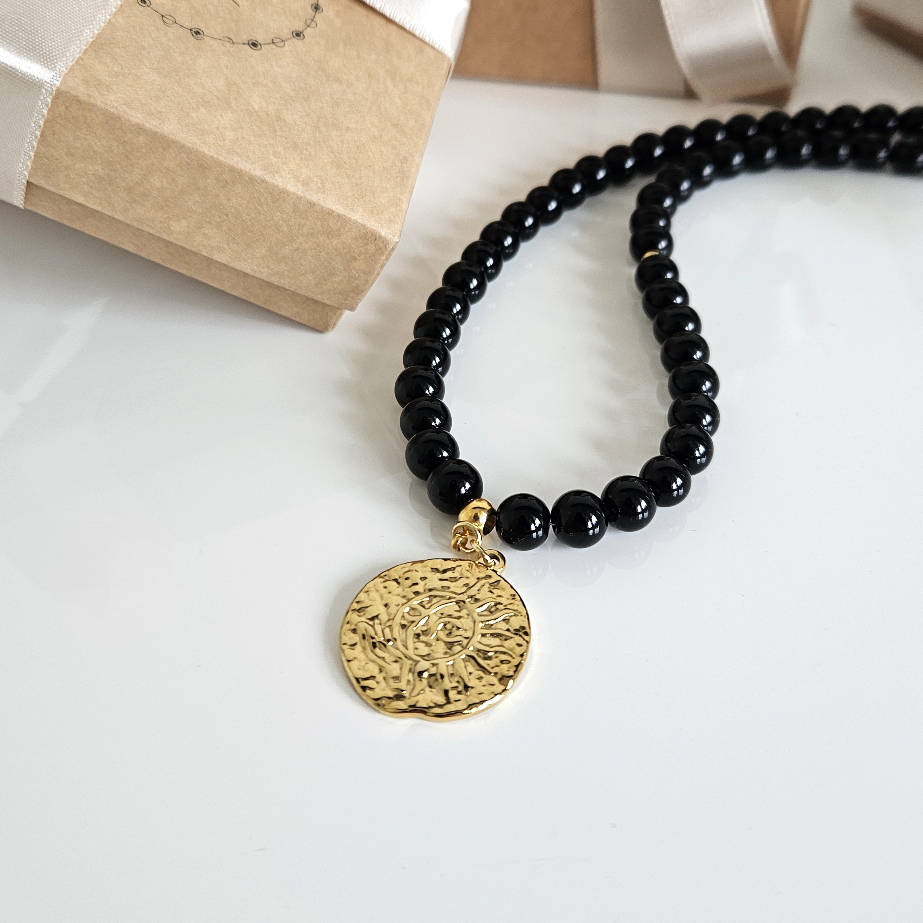 Elegantiškas onikso vėrinys su medaliono pakabuku - tai ne tik papuošalas, tai istorija. Vėrinys - puikus pasirinkimas norinčioms pabrėžti savo individualų stilių.