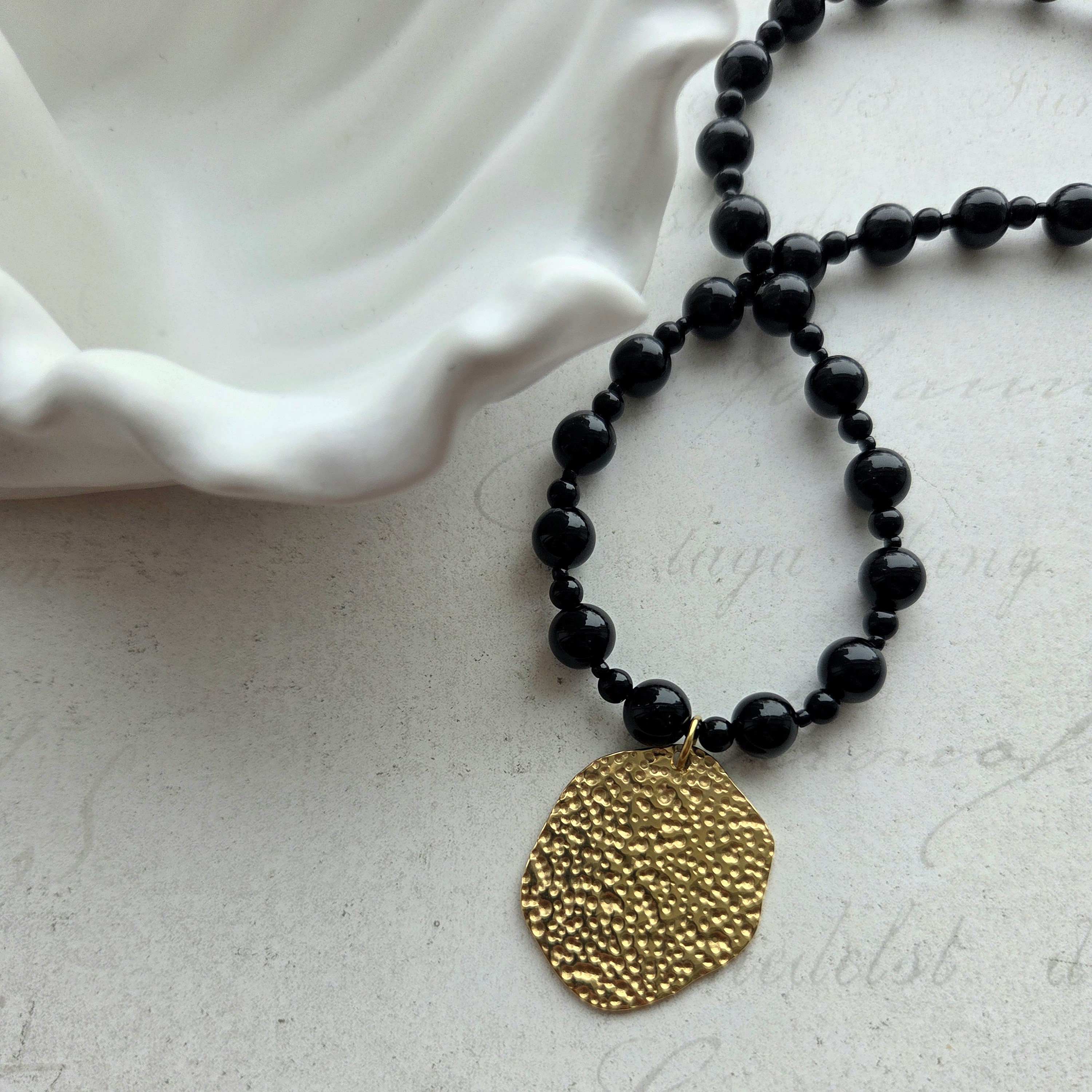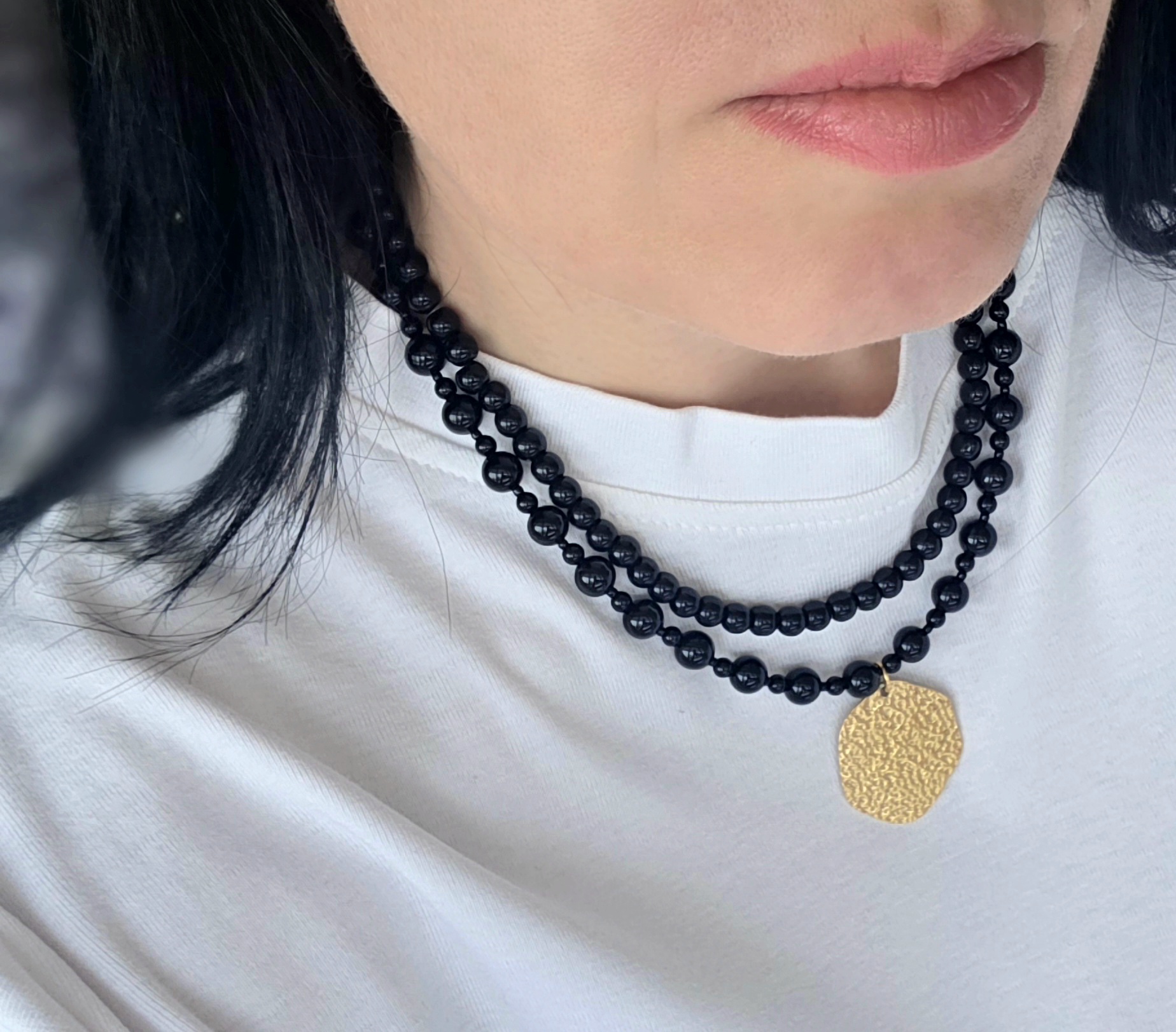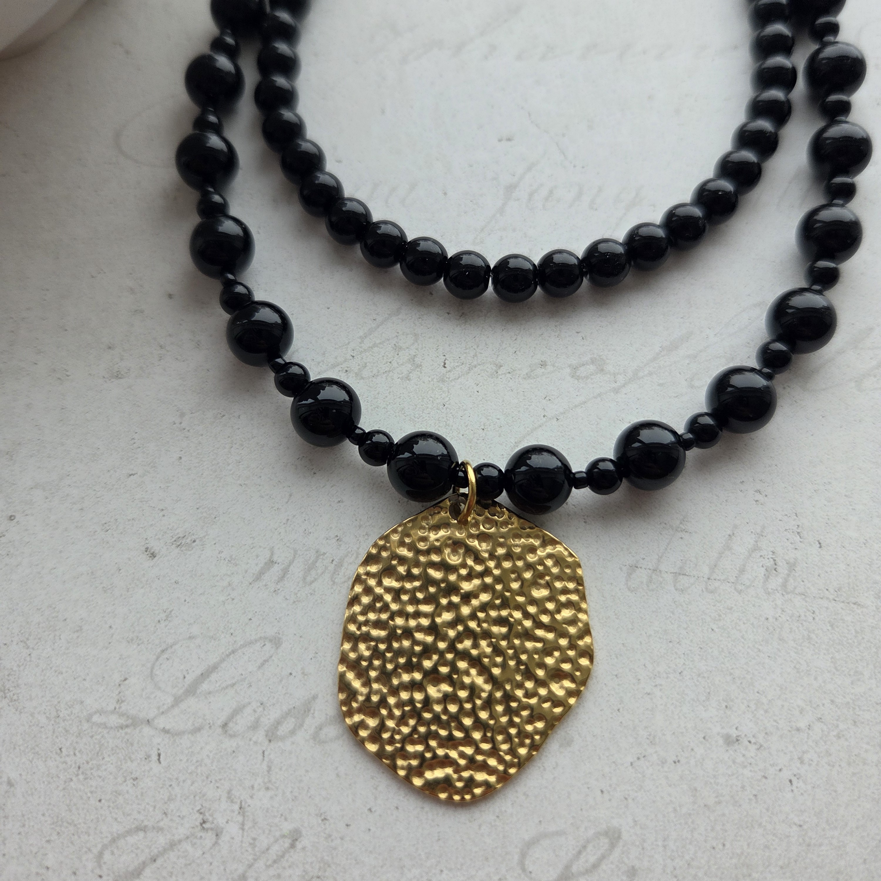 Elegantiškas onikso vėrinys su nuostabaus grožio faktūriniu pakabuku - tai ne tik papuošalas, tai istorija. Vėrinys - puikus pasirinkimas norinčioms pabrėžti savo individualų stilių.